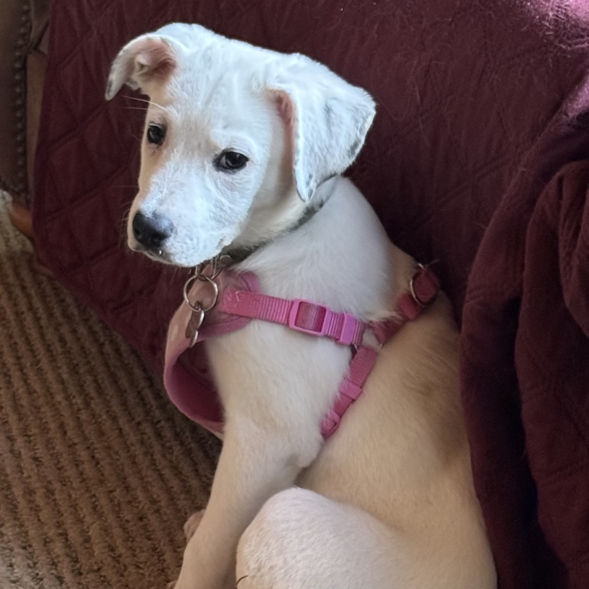 Mom says my spots are becoming more defined on my ears, I have the softest white fur, and black eyes that melt her soul.