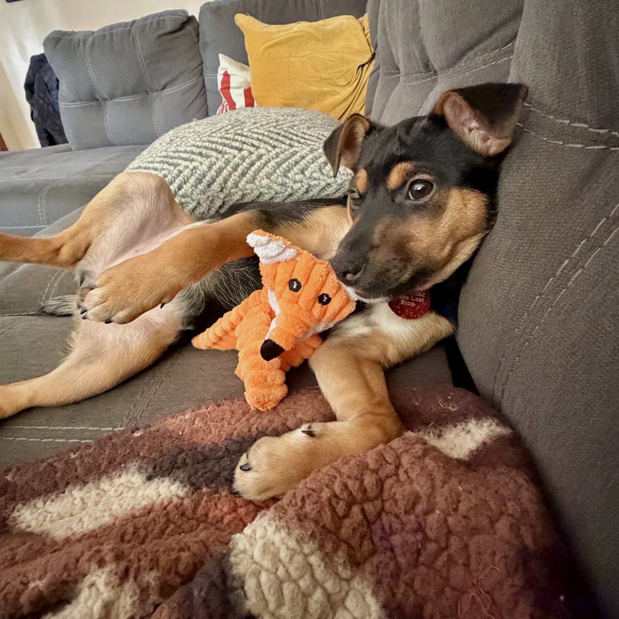 Corita is a happy playful puppy with an “off switch” that also allows her to enjoy long lounges on the couch. She gives the best cuddle naps, loves being around people, and the action! Attention is Corita’s love language; she is eager and easily happy in busy places with people- social butterfly! Corita enjoys playing twitch other dogs and is fine with cats. She loves dog savvy children and meeting new people! She’s a charming, attentive, cooperative puppy that LOVES to play hard when it’s time to turn up and let loose! She adores her toys, especially chewy or soft ones that squeak, and will amaze you with her speed and agility during an intense game of fetch!