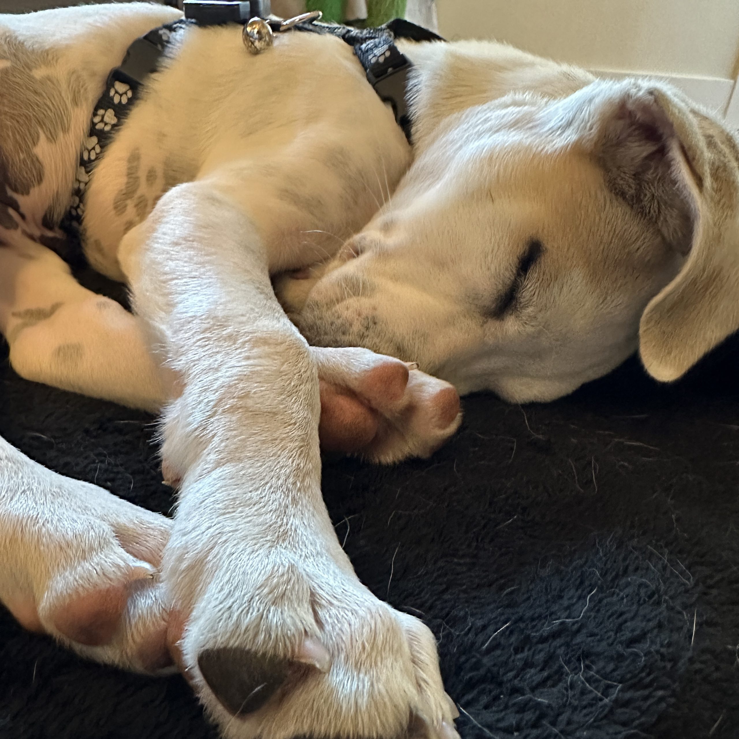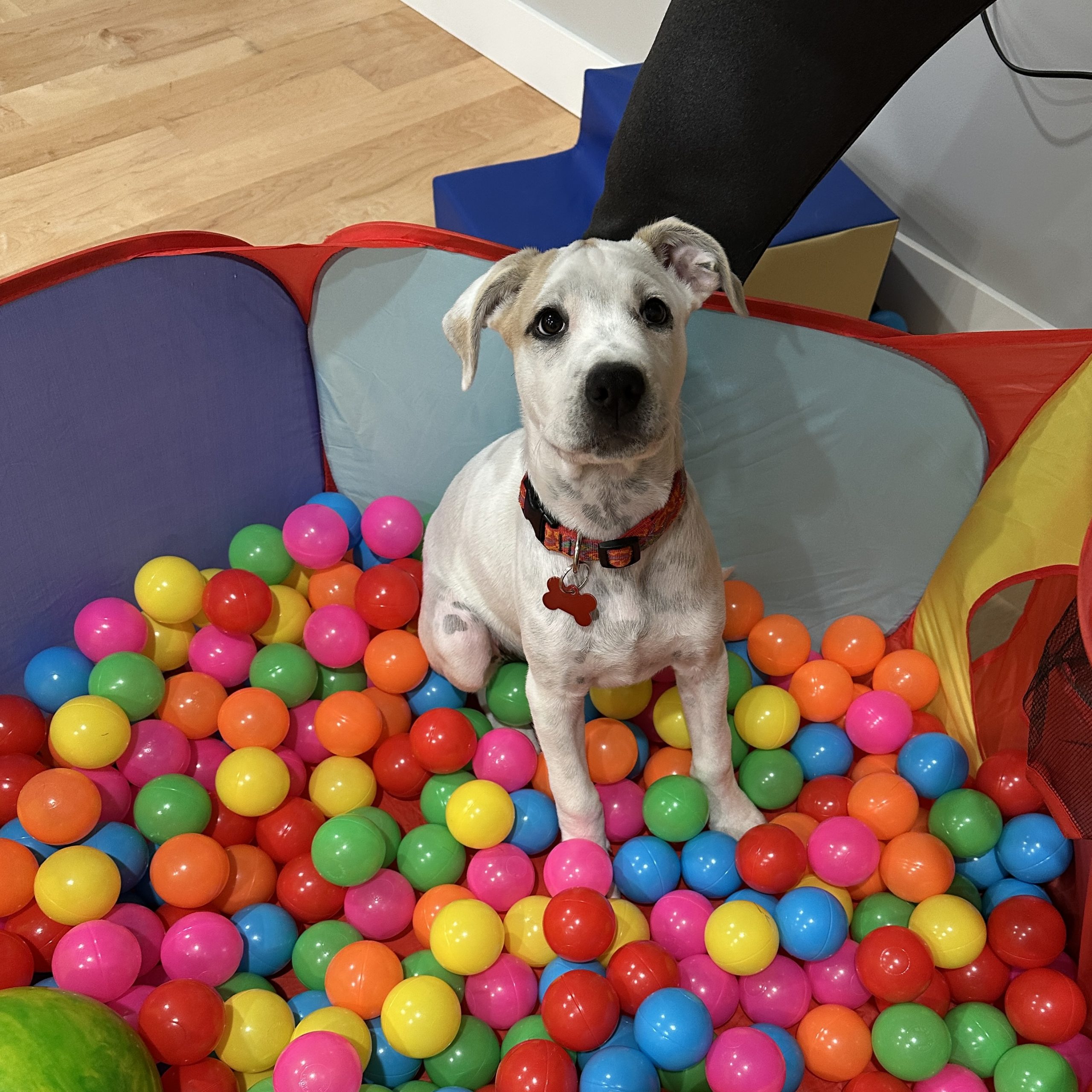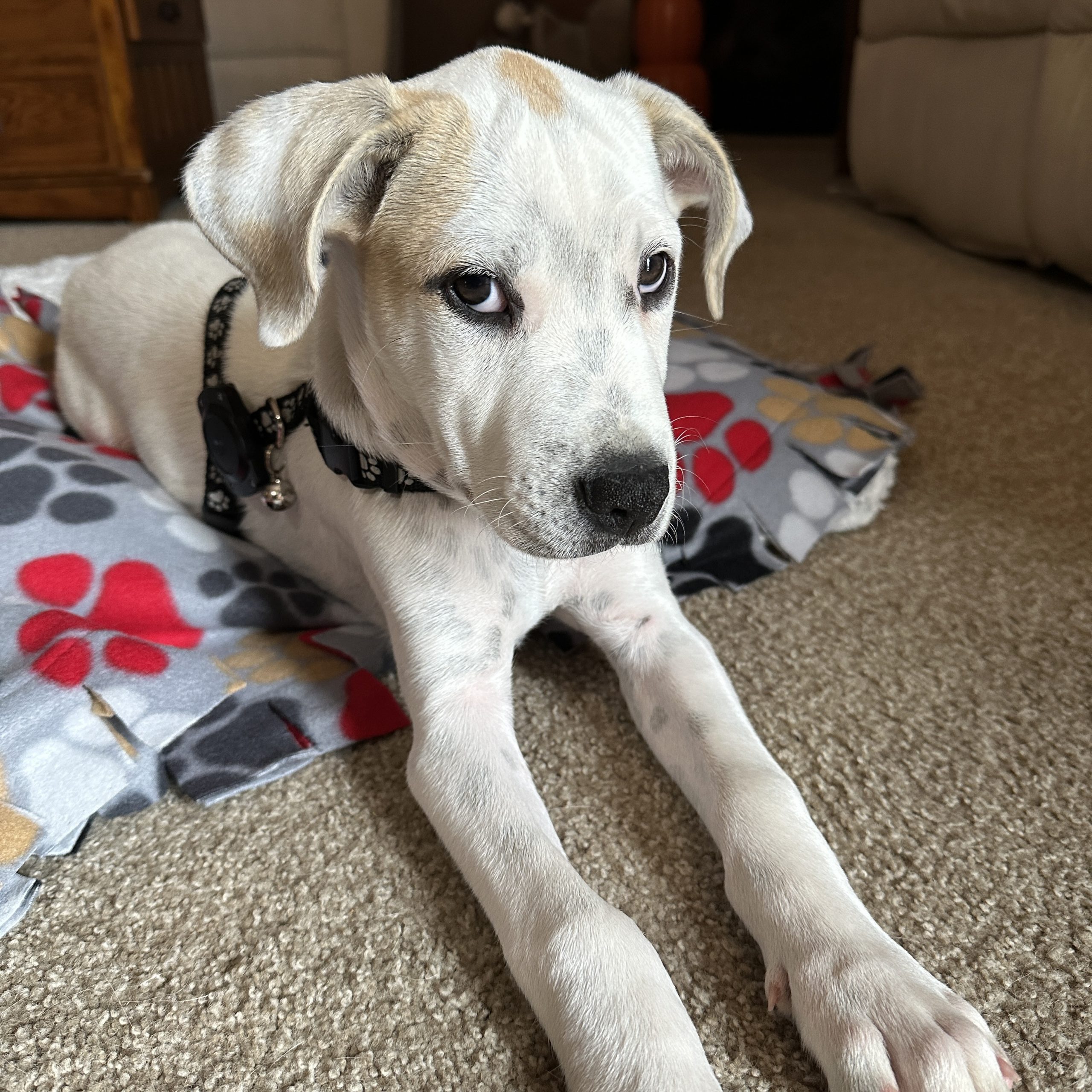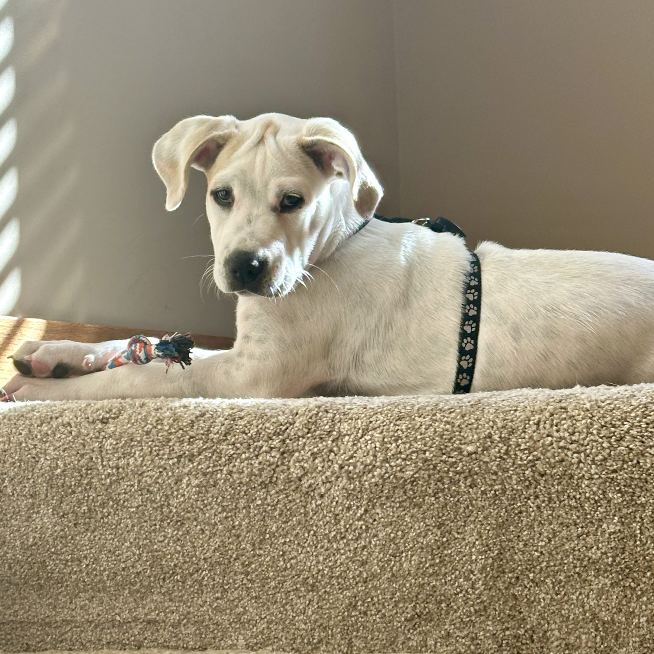 Earnest, Ernie to his foster family, is an incredible puppy. He is well-mannered and knows to sit when he wants or needs something from his humans. He is a gentle pup with a silly, playful personality. Ernie matches the human energy around him. If the humans in the house are playful, Ernie is playful. If the humans want to snuggle, he’s all for that. He’s a big pup weighing in at 22 pounds, and he is firmly convinced that he’s a lap dog. Ernie loves to go for walks, and his favorite toys are the Benebone chew toys, specifically designed for aggressive chewers.