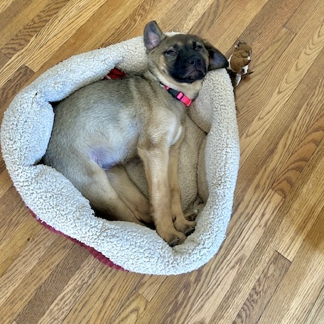 Josie is full of sweet puppy personality- she loves chasing around toys and exploring the backyard. She gets along well with other dogs, and loves playing with them, or just following them around. Josie enjoys meeting new people and is always ready to give kisses and puppy wiggles. When she’s all pooped out, she is ready for a snuggle nap! Josie is learning to behave very well- she is a smart girl. Potty and crate training are going well and she has learned to sit for treats. Walking on leash is going well and is very fun- there is so much to see in the world! If you’re looking for a great mix of playful and snuggly, Josie is the puppy for you!