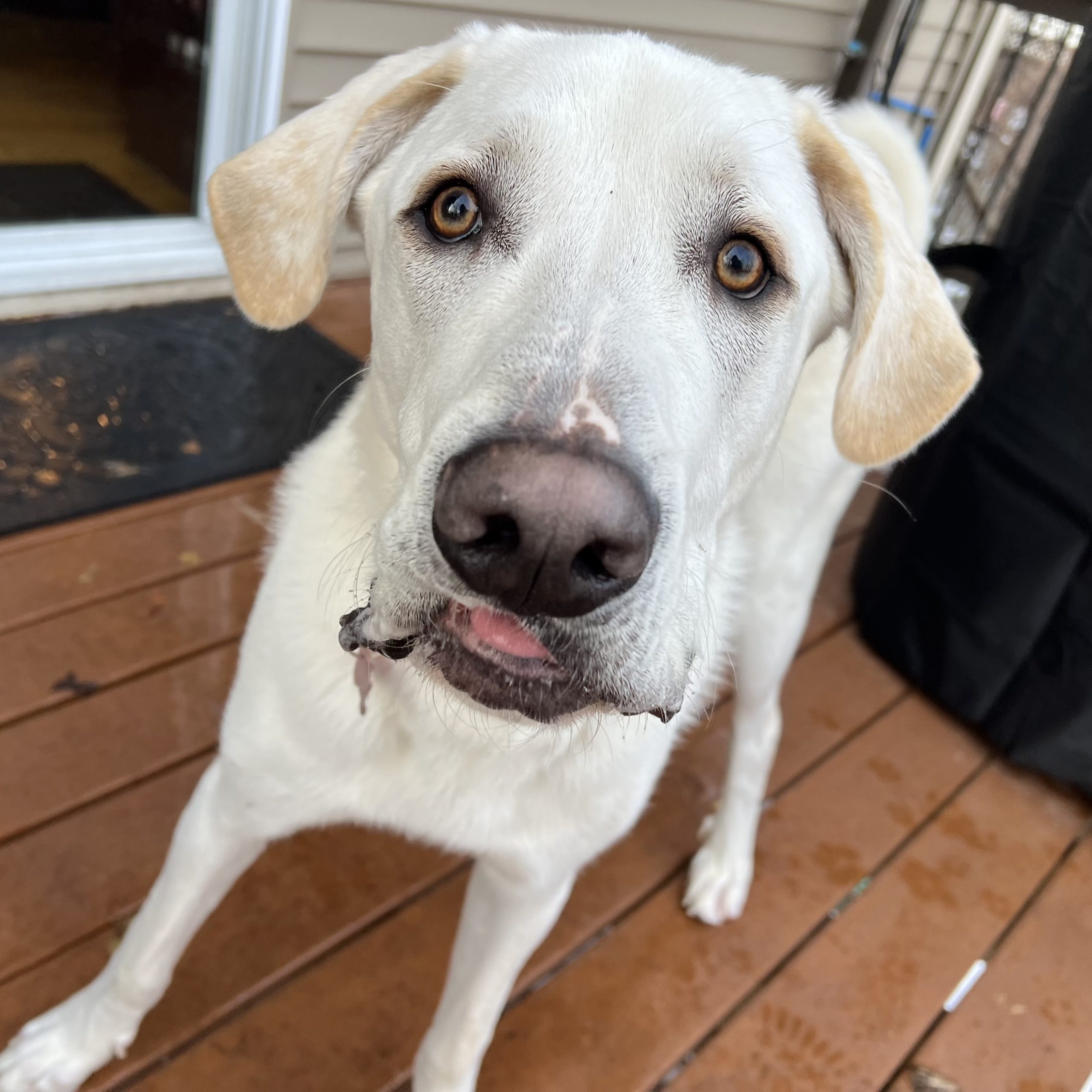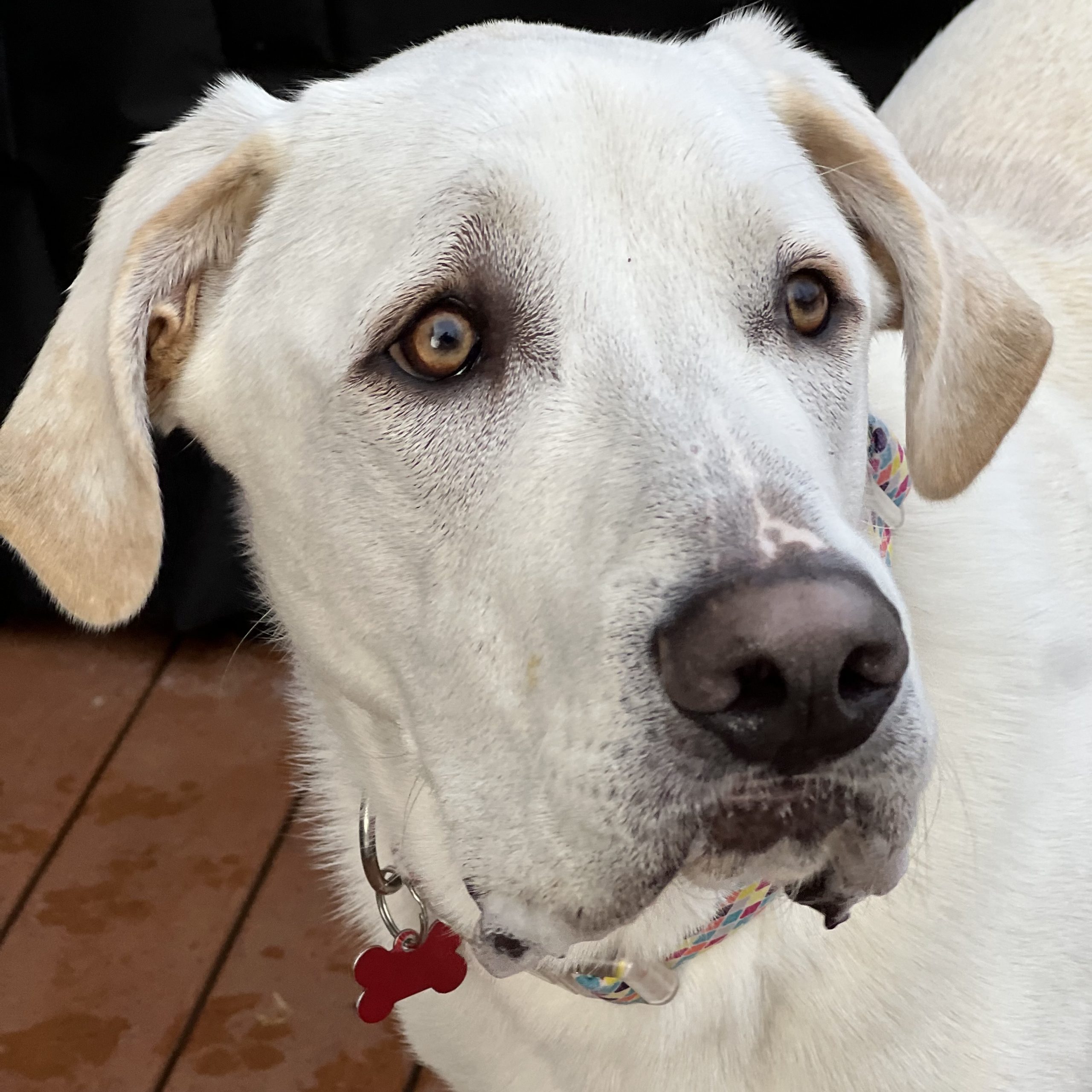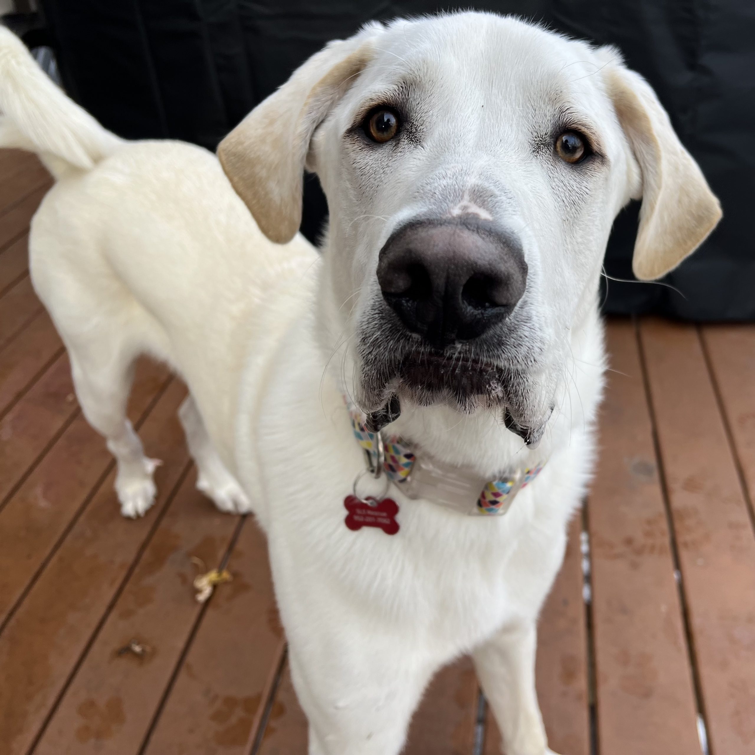 Maverick is a stunning Great Pyrenees and Labrador mix with a big heart. At first glance, his snow‑white fur, soulful brown eyes and curly tail will win you over. His happy nature and playful spirit make him unforgettable. His personality is sweet, loyal, and affectionate. Maverick loves belly rubs, being near his people and/or being outside. He loves to play and romp and is a perfect balance of calm lap cuddler and joyful playmate. Maverick enjoys meeting new people, hanging out or playing with other dogs, and thrives in a home and a fenced in yard where he can stretch out, relax and frolic. If there are children in a home, Maverick will do best with teenagers vs young children because of his size and young nature. Maverick is a smart boy who is eager to learn more and work for treats! He is house trained and enjoys his crate. He is also the easiest dog to take photos of- he is a handsome dude!