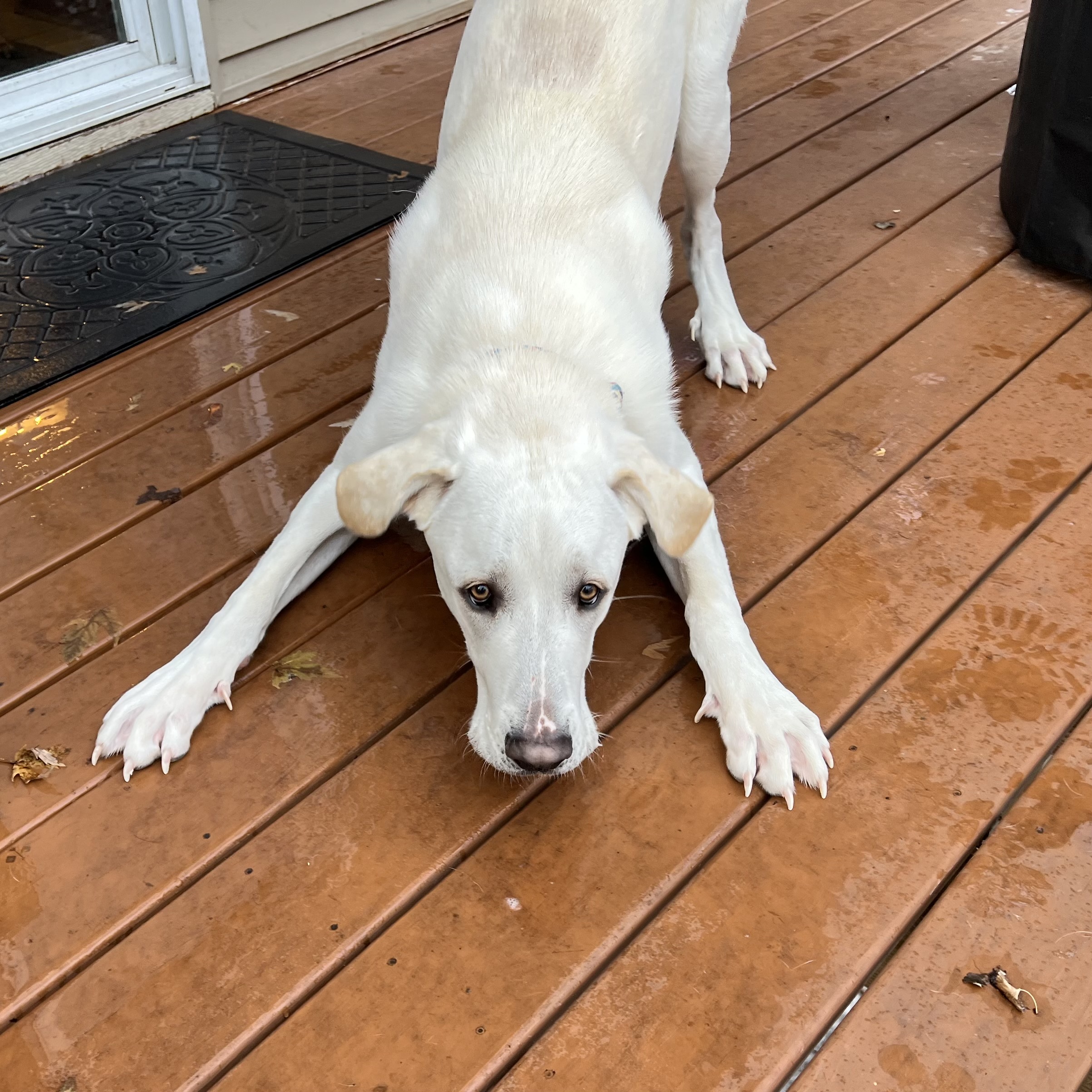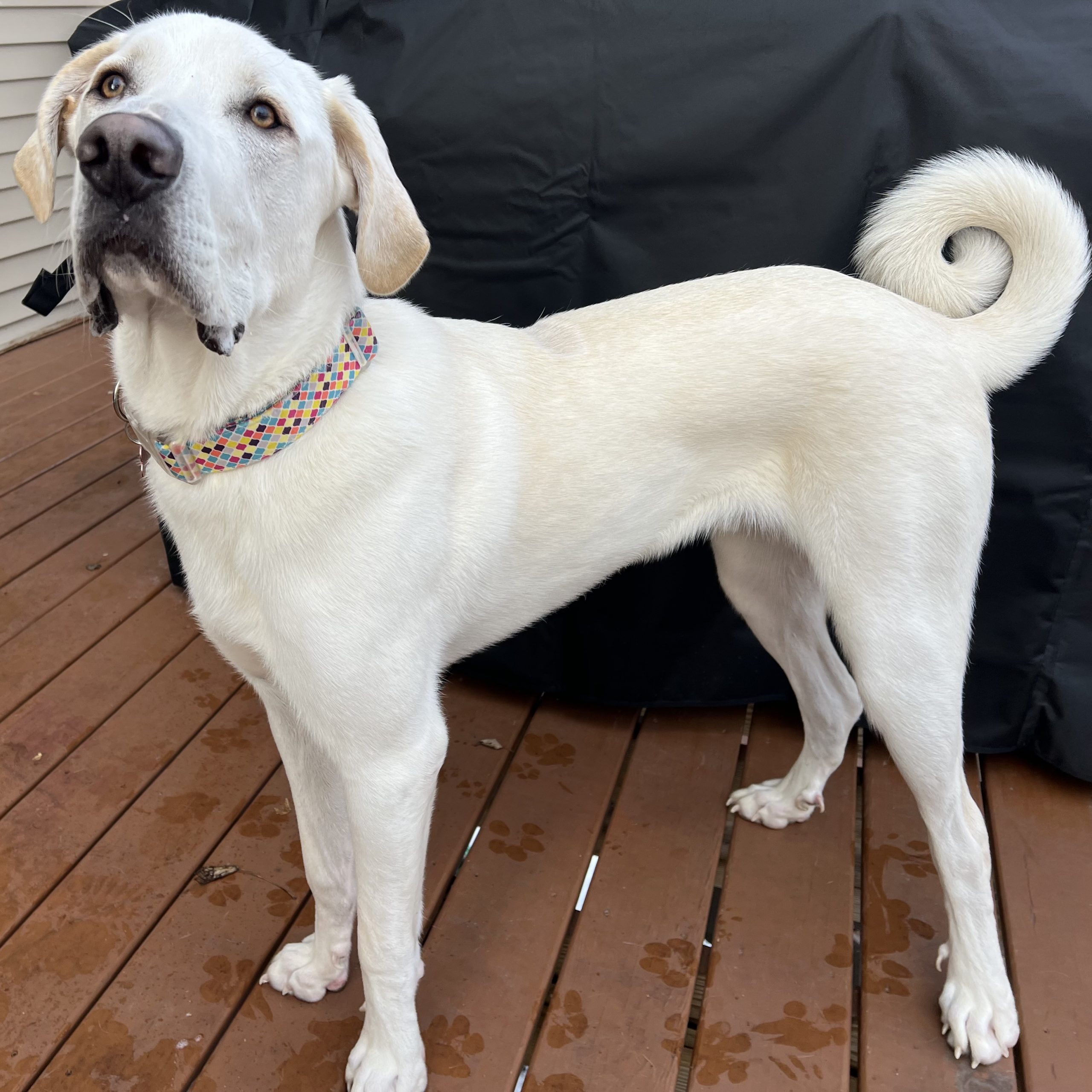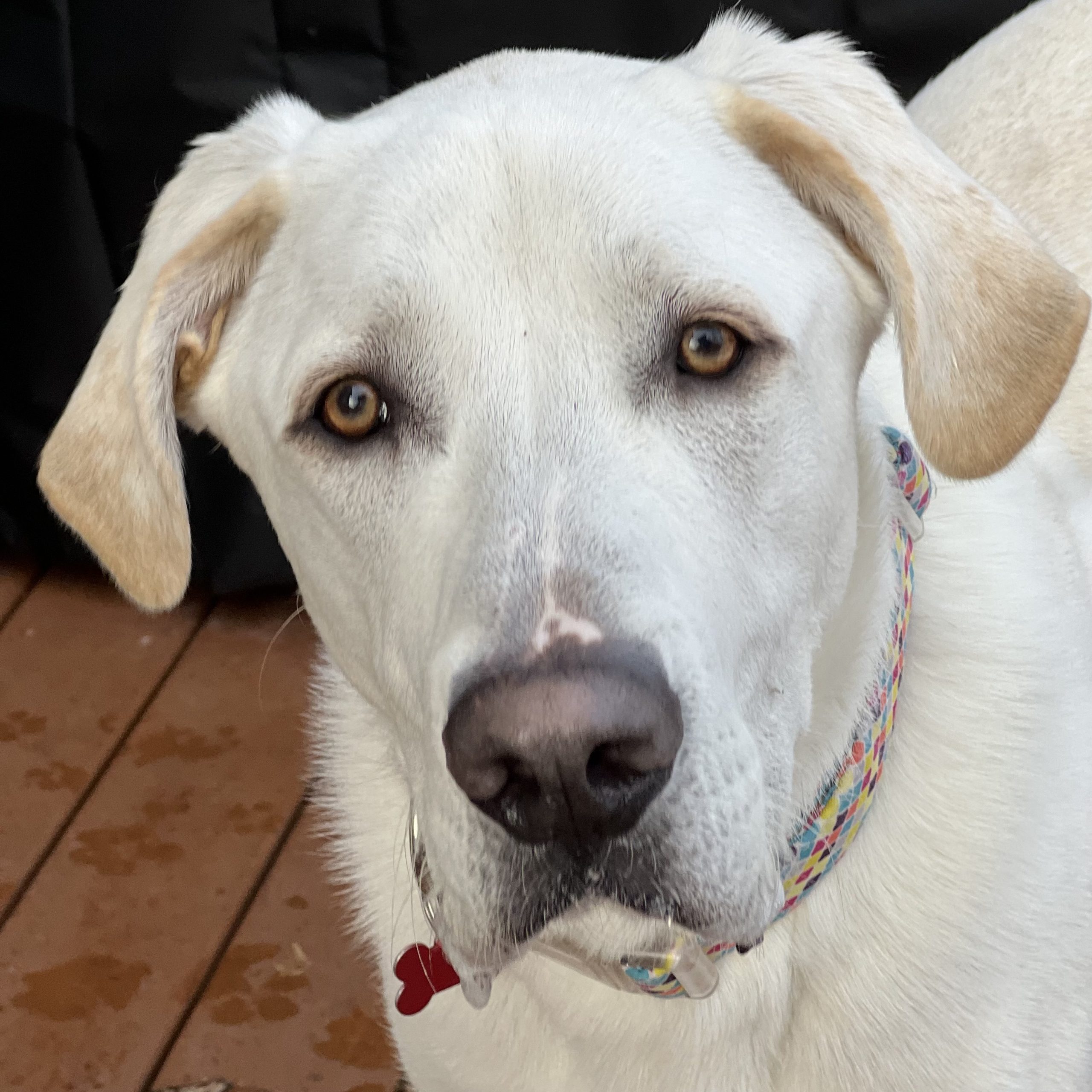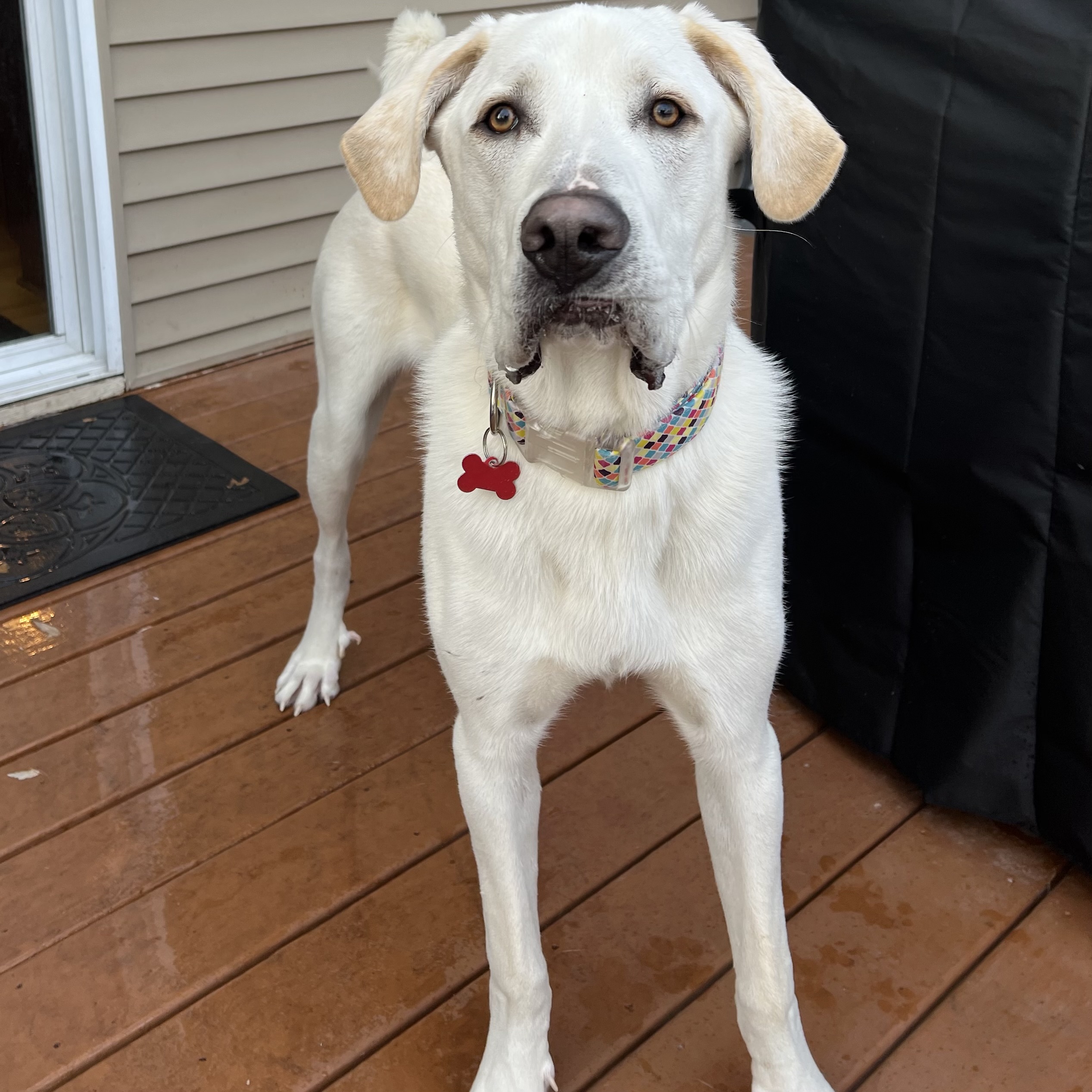 Maverick is a stunning Great Pyrenees and Labrador mix with a big heart. At first glance, his snow‑white fur, soulful brown eyes and curly tail will win you over. His happy nature and playful spirit make him unforgettable. His personality is sweet, loyal, and affectionate. Maverick loves belly rubs, being near his people and/or being outside. He loves to play and romp and is a perfect balance of calm lap cuddler and joyful playmate. Maverick enjoys meeting new people, hanging out or playing with other dogs, and thrives in a home and a fenced in yard where he can stretch out, relax and frolic. If there are children in a home, Maverick will do best with teenagers vs young children because of his size and young nature. Maverick is a smart boy who is eager to learn more and work for treats! He is house trained and enjoys his crate. He is also the easiest dog to take photos of- he is a handsome dude!