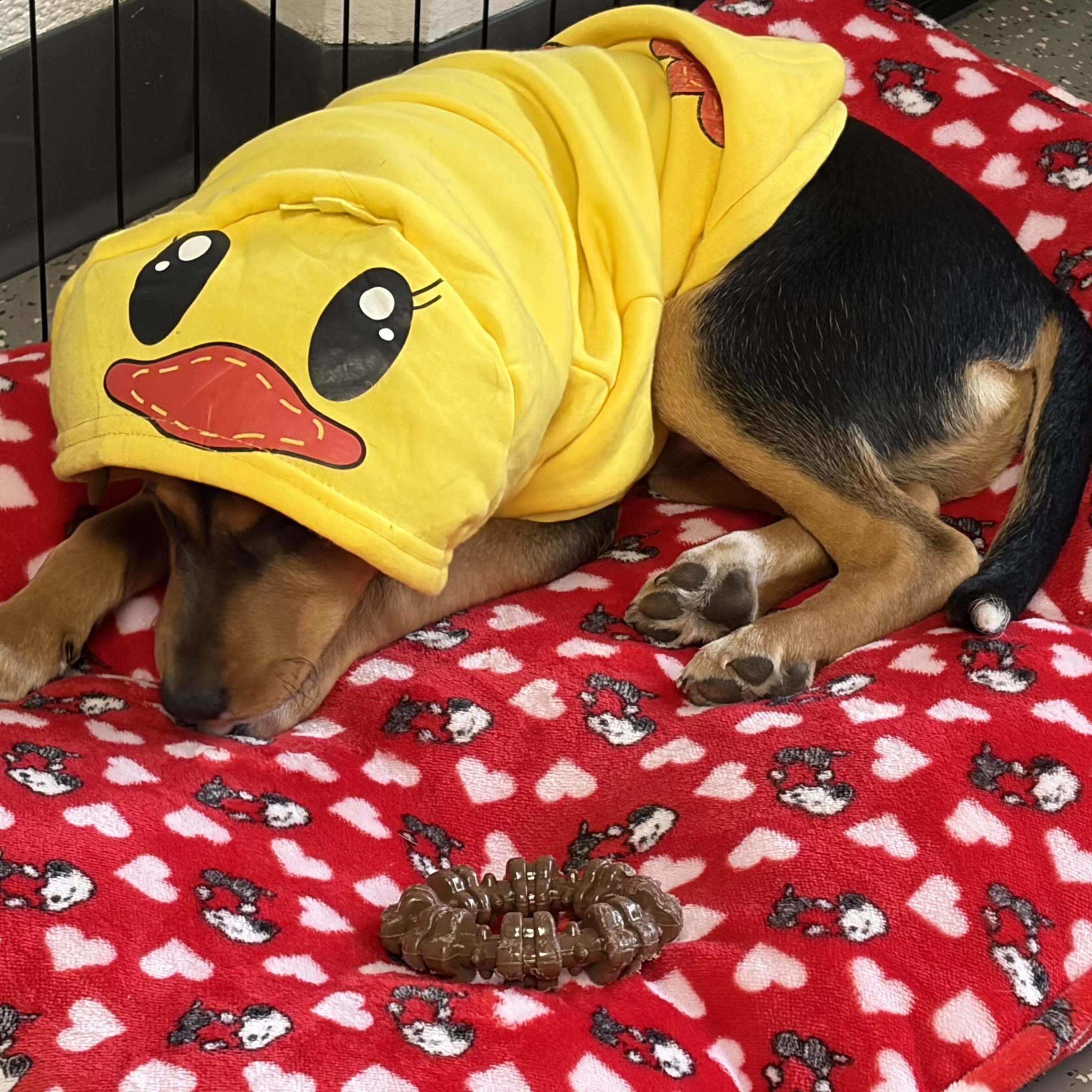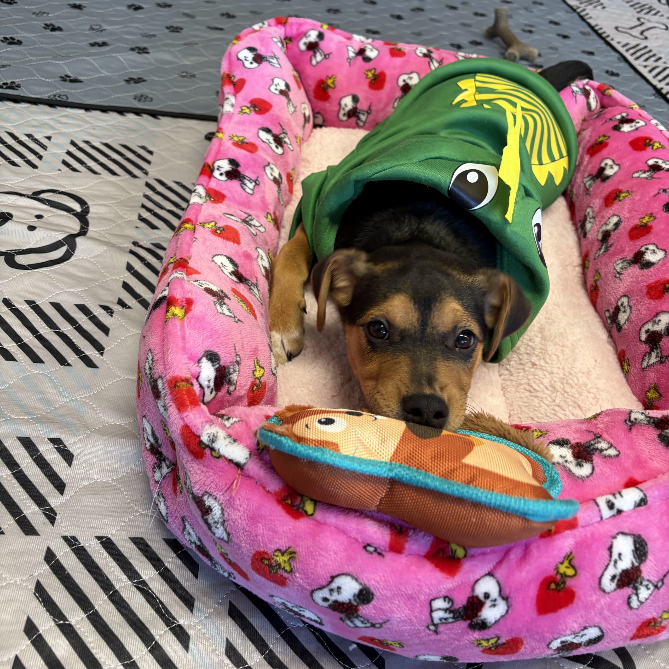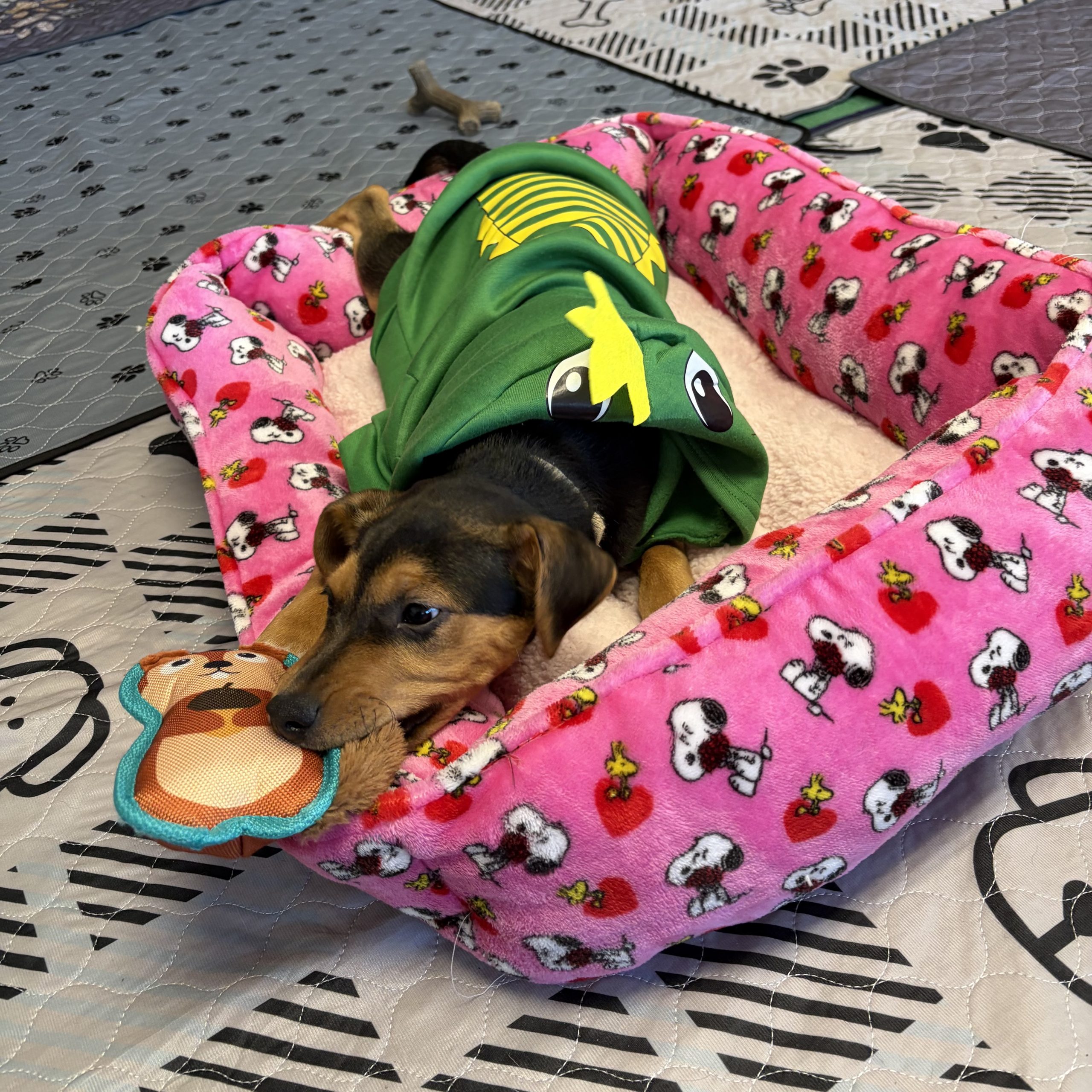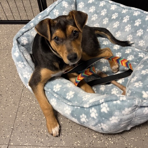 He is comfortable in a crate and can sleep through the night. He is working on potty training and is figuring out bell training to let his foster mom know when he needs to go outside. Everyday. Nelson is getting more secure and is loving learning, playing and loving! Come meet this little guy- he is so fun!