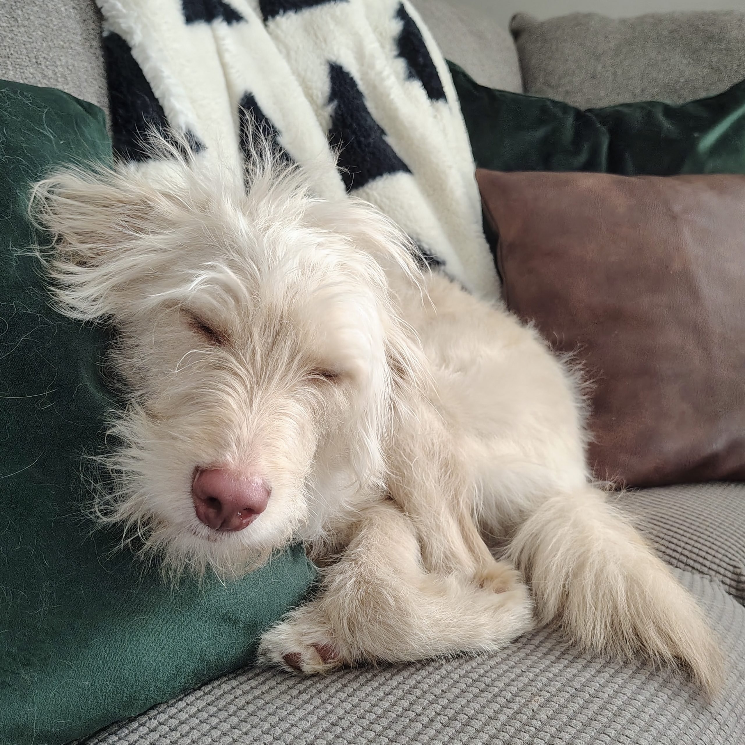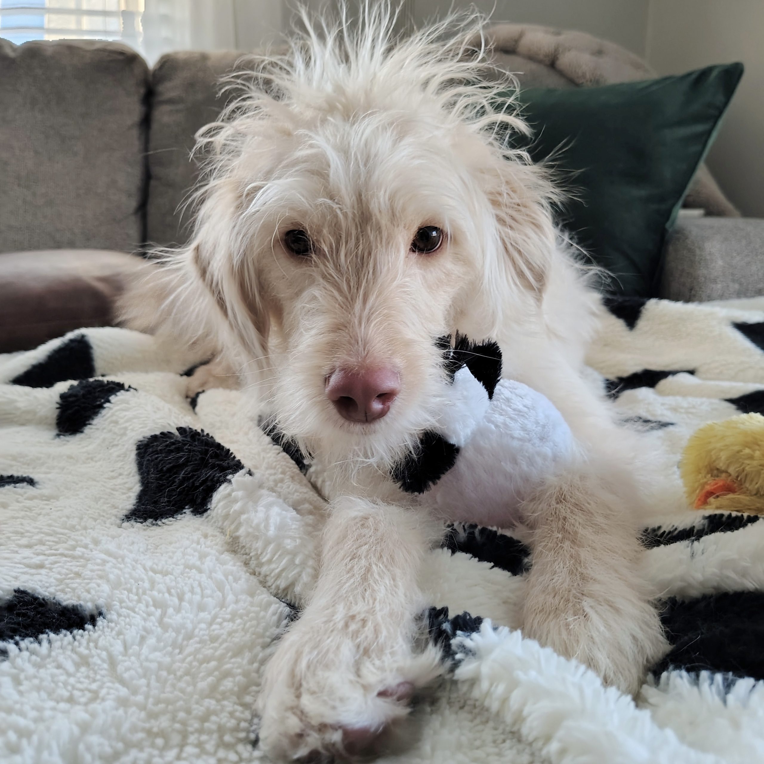 Pearl is around 1 and a half years old and is ALL legs, only weighing about 30 pounds. She is extremely affectionate and loves snuggling up right next to you on the couch, she will also sneak in quick licks/kisses when she can. Pearl is so funny and when she gets really exited she springs up in the air, it is absolutely adorable and sure to put a smile on your face! Pearl loves all toys but will still dig her way to the bottom of the toy bin to find the hidden gems. Pearl is also very smart and will likely pick up on training quickly, she learned how to sit for a treat and runs straight to her kennel when it’s time to eat! She is very eager to please her people and picks up on the routines quickly, but is still learning so would do best in a patient home.