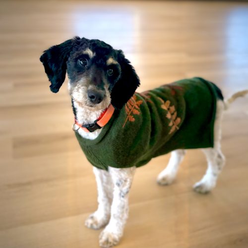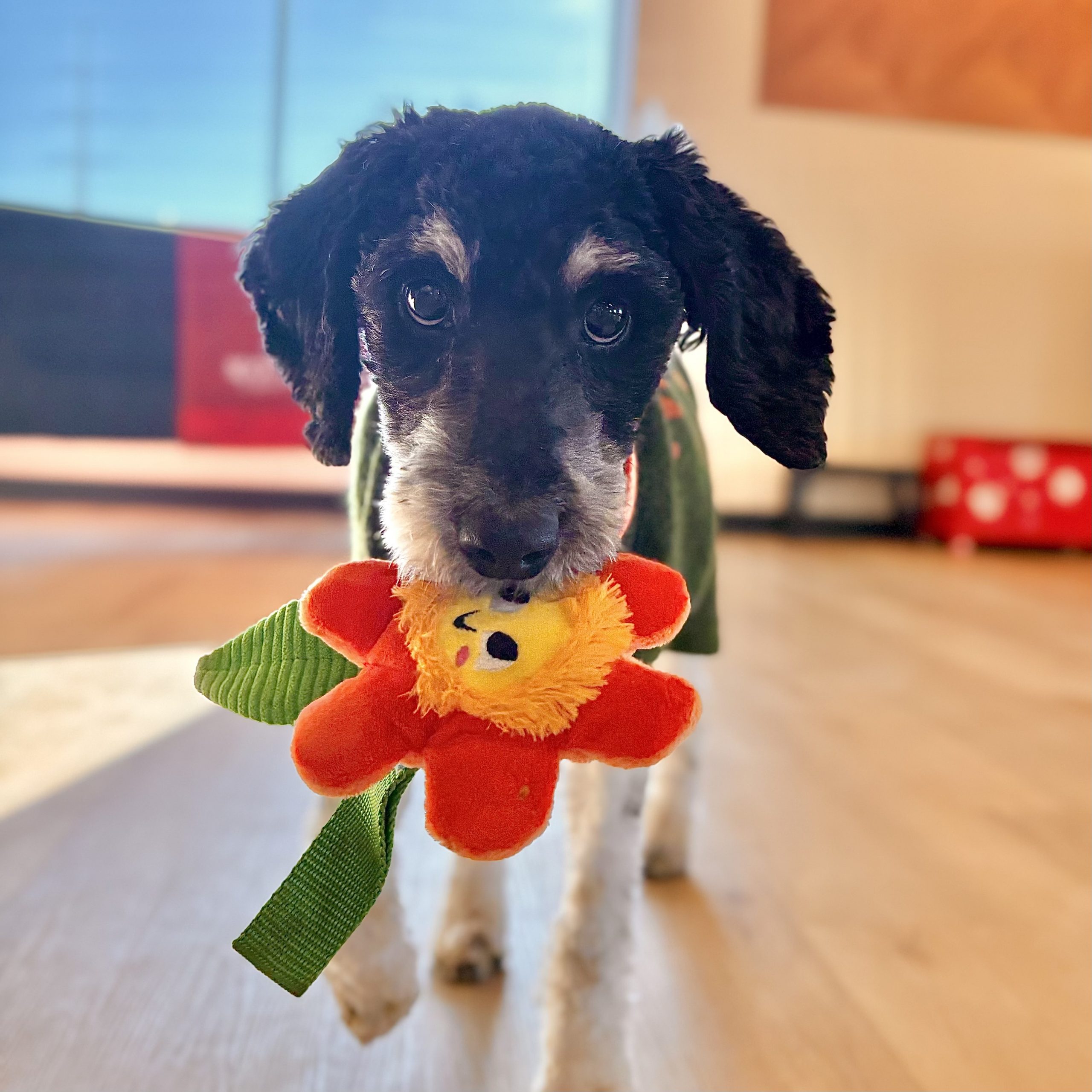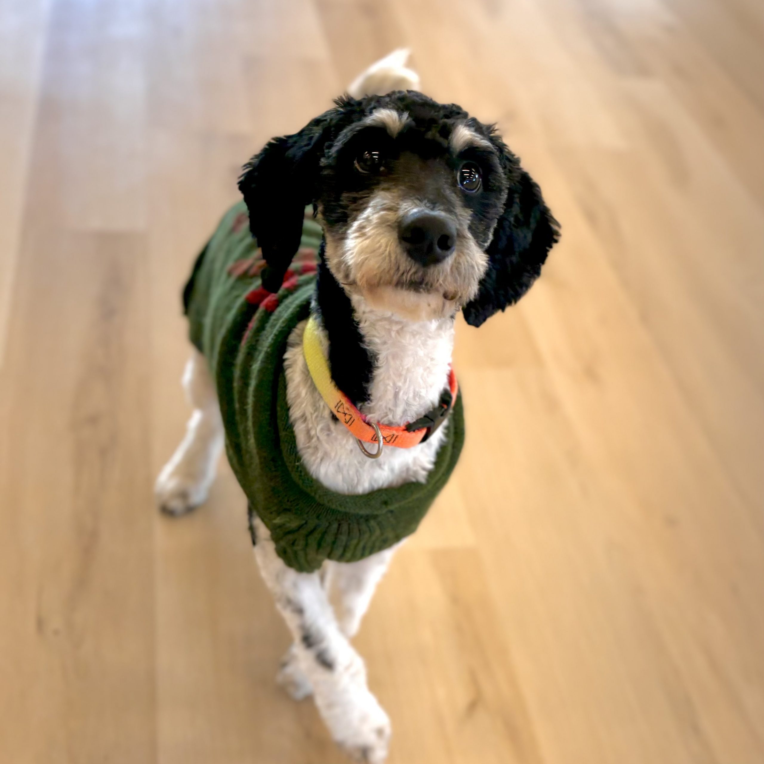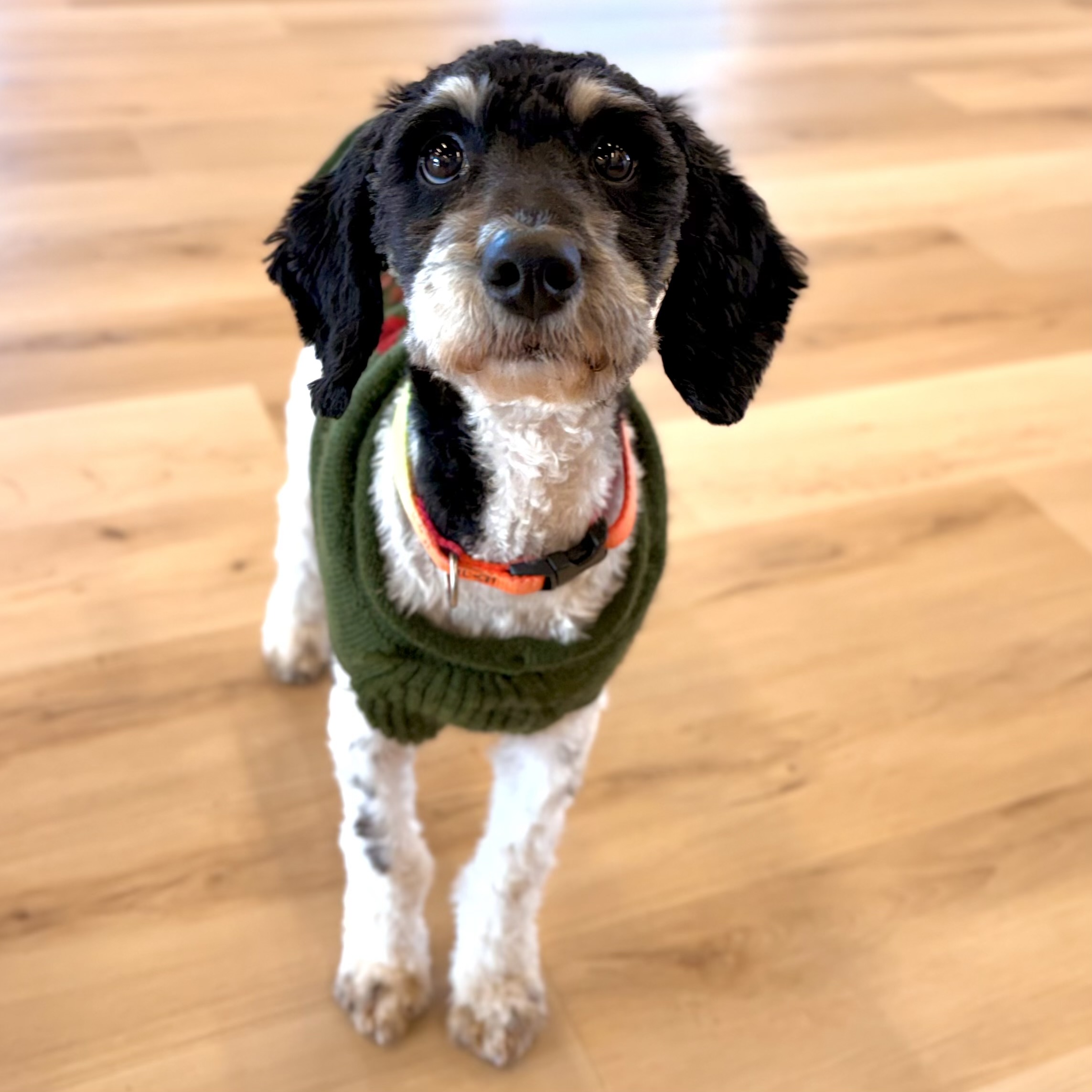 Phin is a 6-month-old mini Bernedoodle with the sweetest black-and-white spotted coat and an even sweeter personality to match. This playful little guy loves toys, romping around with other dogs, and soaking up all the attention he can get from his people.