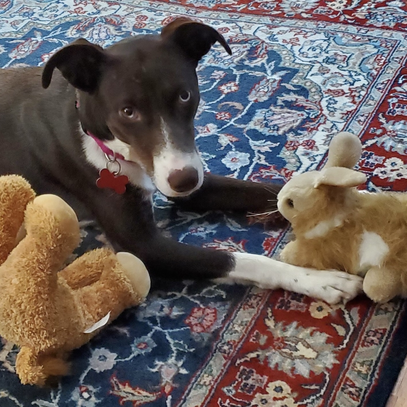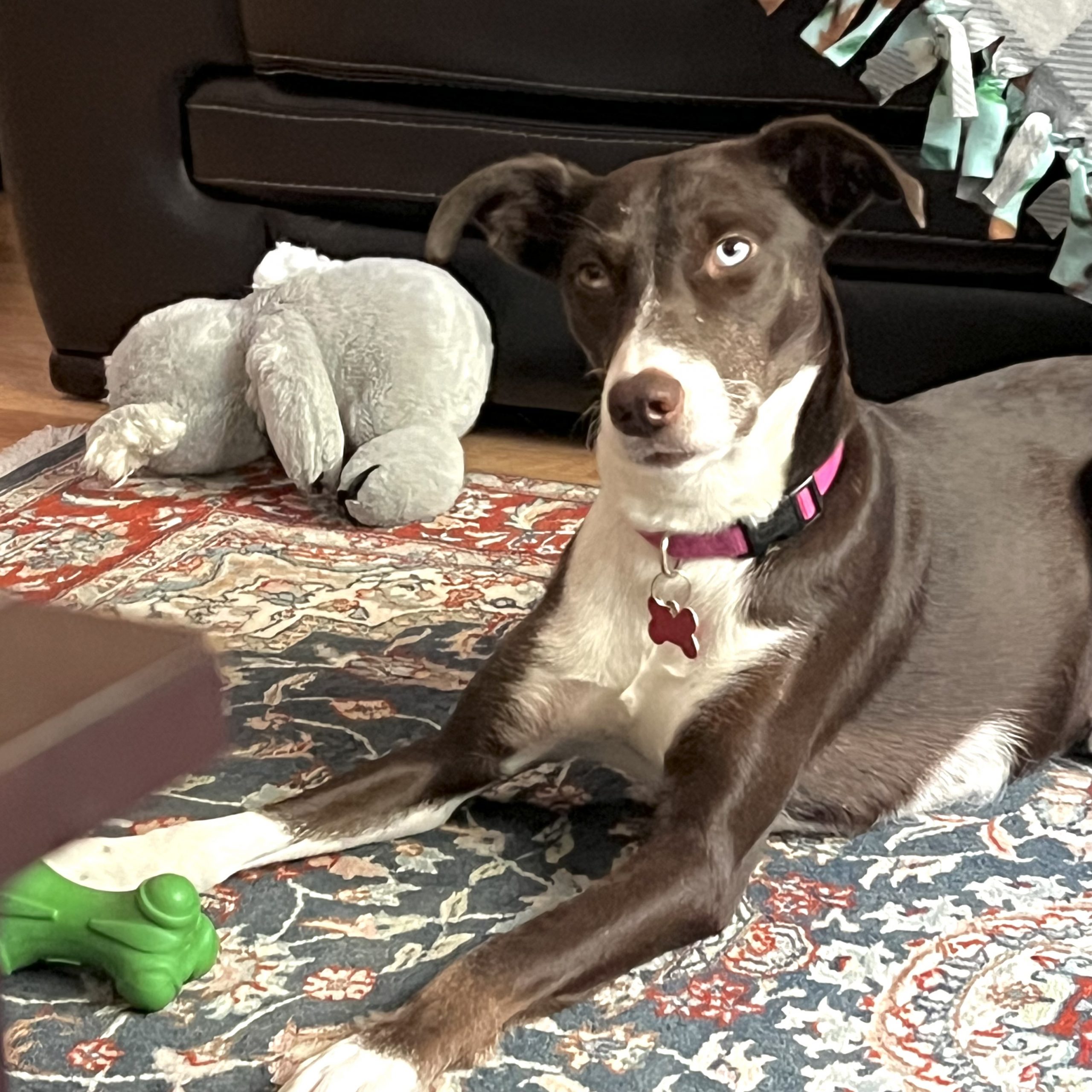 My fosters love the fact that I don’t bark but they do say I have a funny howl, and they think I am talking, yelling or simply saying “I wove you” to them. My current home does not have a doggie; however, they did have one stay for a few days, and we had a blast! If you have a doggie, that would be great, but I am also comfortable hanging on my own with my hoomans. I have found playing with my stuffies is entertaining enough for me.
